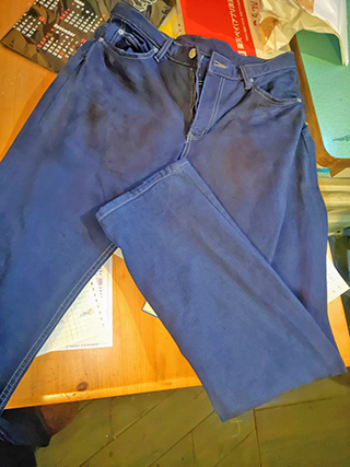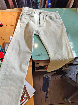 東京からT様、漂白しすぎて白くなりすぎた、ジーンズ、ブルーに染め直し。ご注文は薄めのブルー![]() |